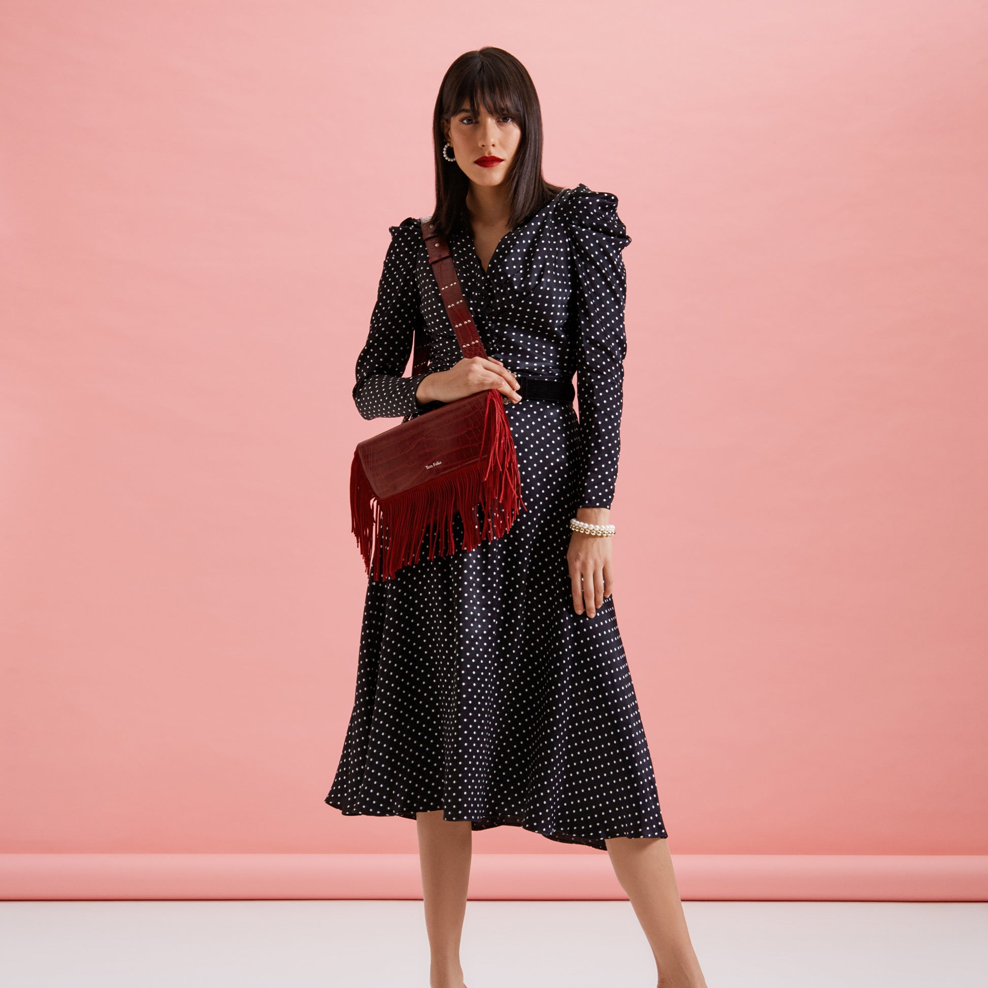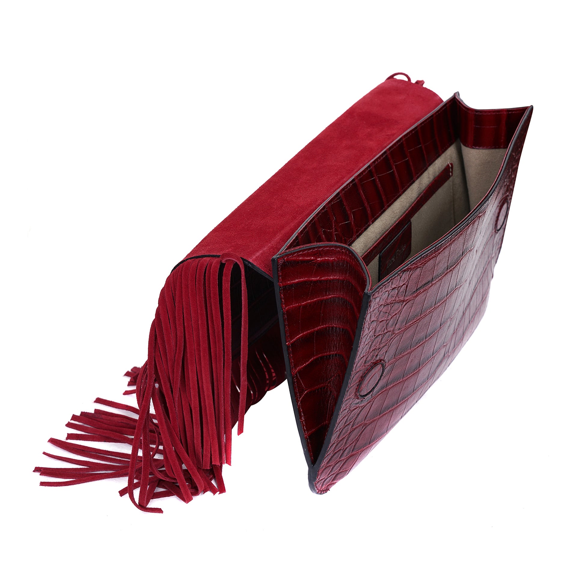 This statement bag blends luxury and playfulness, handcrafted in Istanbul from high-quality local leather in smooth or bold croco-embossed textures. Its sleek, rectangular shape is finished with flowing fringes, adding lively energy to your look. Designed to carry your essentials, it can be worn as a clutch or hands-free with a detachable, leather-studded shoulder strap.