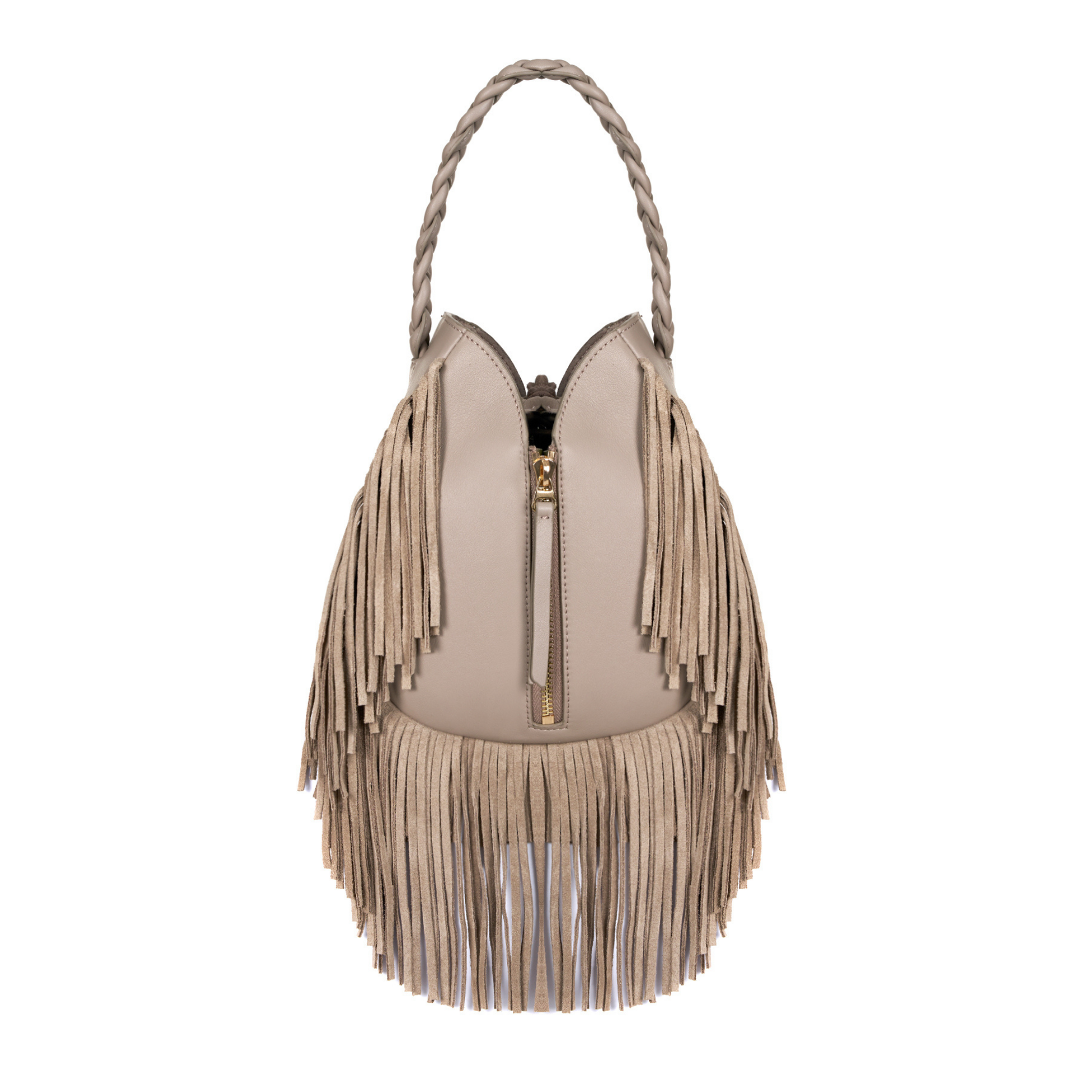 This design combines elegance and playful authenticity in two stunning options: porcelena or smooth tan leather. Its sleek tulip silhouette is finished with tassels for a unique, eye-catching touch. A practical drawstring closure keeps your essentials safe, while the removable strap allows it to transition effortlessly from shoulder to wrist.