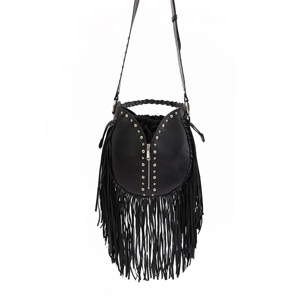 With smooth calf leather, eye-catching silver studs, and long tassels, this chic Western-style bag makes a statement. Carry it by the braided handle or long strap, and turn heads wherever you go!
