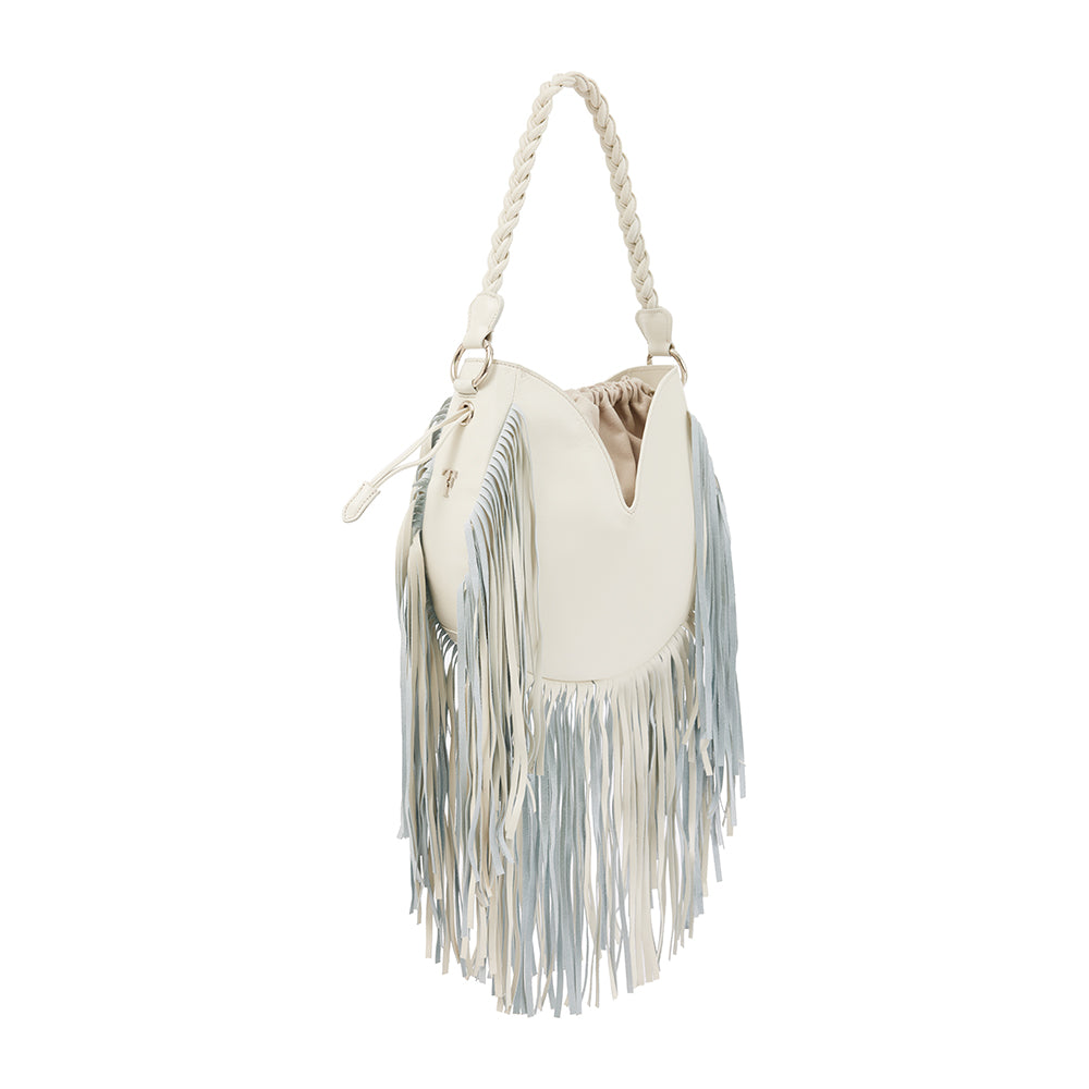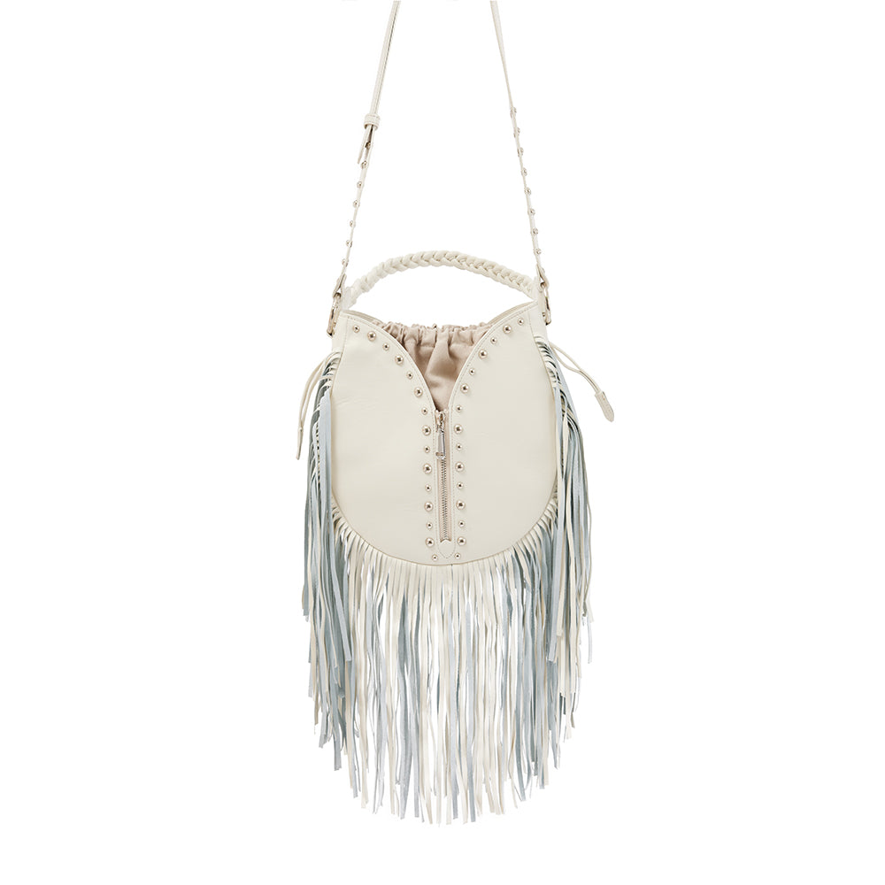Meet the Katherine Royale, a reinvented classic. This elegant piece showcases smooth leather, a graceful tulip shape, and eye-catching silver studs around the central zipper. It boasts longer tassels and a handcrafted braided handle, and securely closes with a drawstring for your convenience. A harmonious blend of contemporary and Western styles defines its unique appeal.