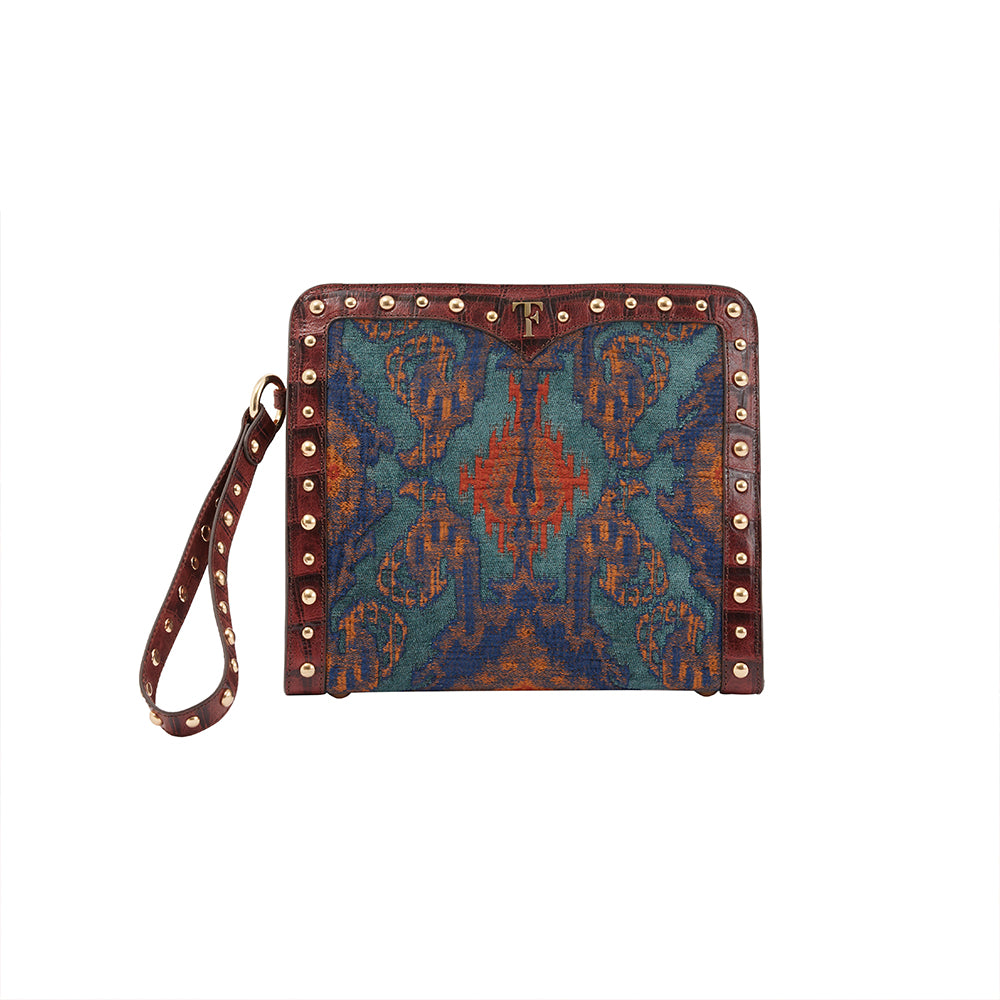 Crafted by skilled artisans, this standout clutch blends traditional Turkish fabrics with croc-embossed leather trims and golden studs, keeping your look effortlessly stylish from day to night!